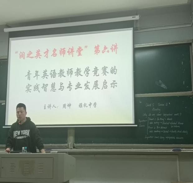 在专题讲座环节,周坤老师结合自身斩获全国英语教学大赛一等奖的实战经验,以“青年英语教师教学竞赛的实践智慧与专业发展启示”为题,进行了自己从赛场到讲台名师的成长密码分享。讲座中,周老师系统阐释了英语教材解读的“三度分析法”(深度、广度、温度)、文本挖掘的“五维透视法”(语言、文化、思维、情感、策略),以及备赛过程中的“三阶打磨法”(初案设计、模拟演练、反思迭代)。他特别强调“未来教师要做‘三有’师者,即第一要有专业定位的清醒认知,或深耕赛课领域成为教学创新者,或专注班级管理成为育人专家;第二要有平台选择的战略眼光,善用校级、市级、省级、国家级竞赛平台体系实现阶梯式个人专业成长;最后要有教学风格的个性表达,在反复打磨中形成‘人课合一'的独特气质。”这番高屋建瓴又接地气的分享,为迷惘中的师范生点亮了专业发展的灯塔。