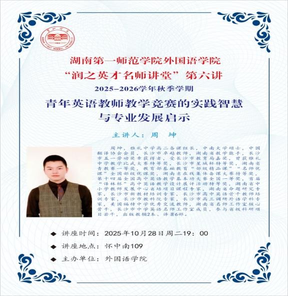 10月28日晚,我院“润之英才名师讲堂”第六讲在怀中南109教室温情启幕。本次讲座特邀湖南省雅礼中学骨干教师周坤担任主讲嘉宾,由副院长陈钰教授主持,公共外语教研二室主任曾碧锋副教授、英语系王小玲老师、翻译系唐江英老师、公共外语教研二室唐新萍老师联袂出席,2023级、2024级英语“润之英才”班全体同学共同参与,共赴一场关于英语教学艺术与专业发展的思想盛宴。